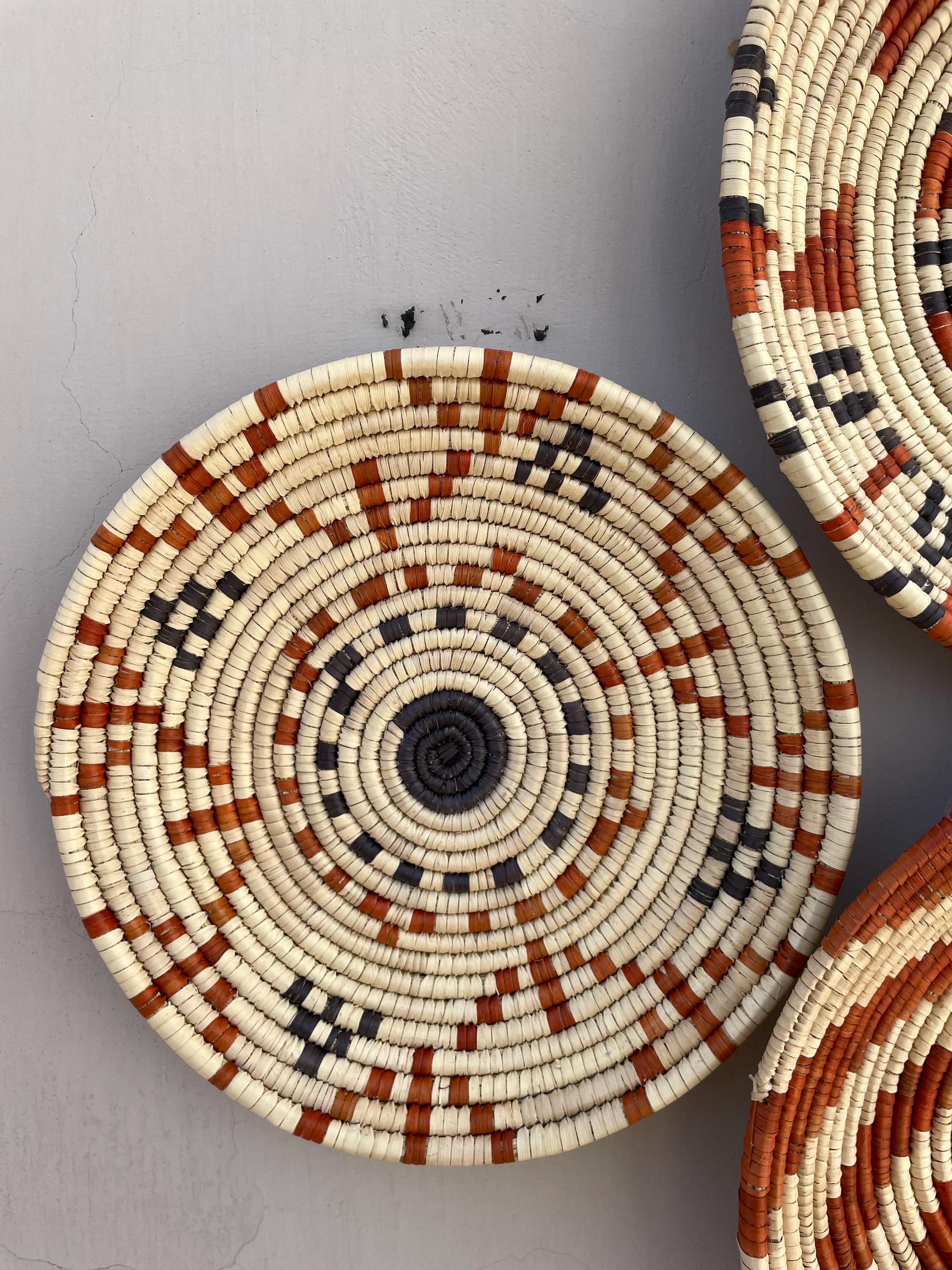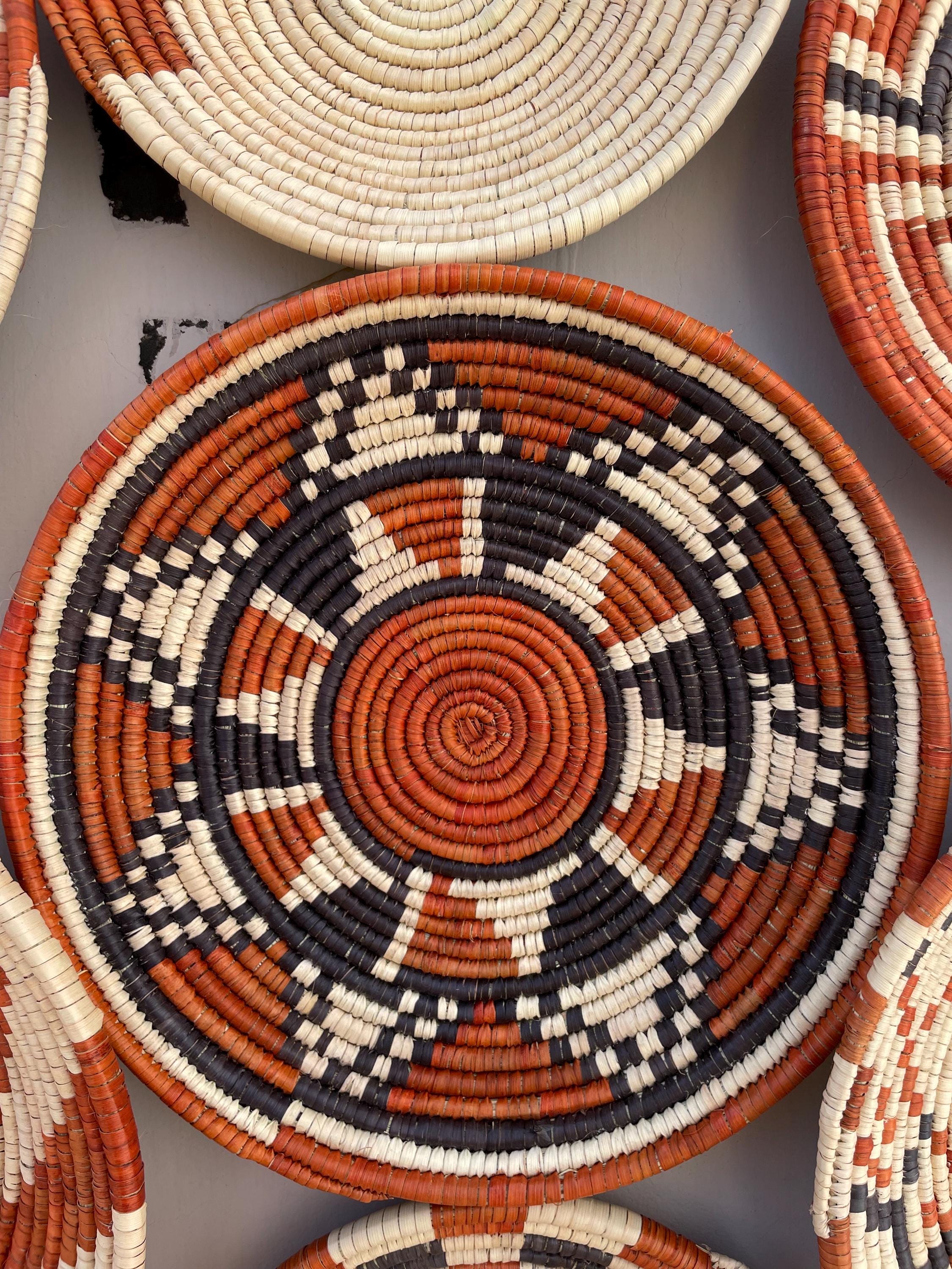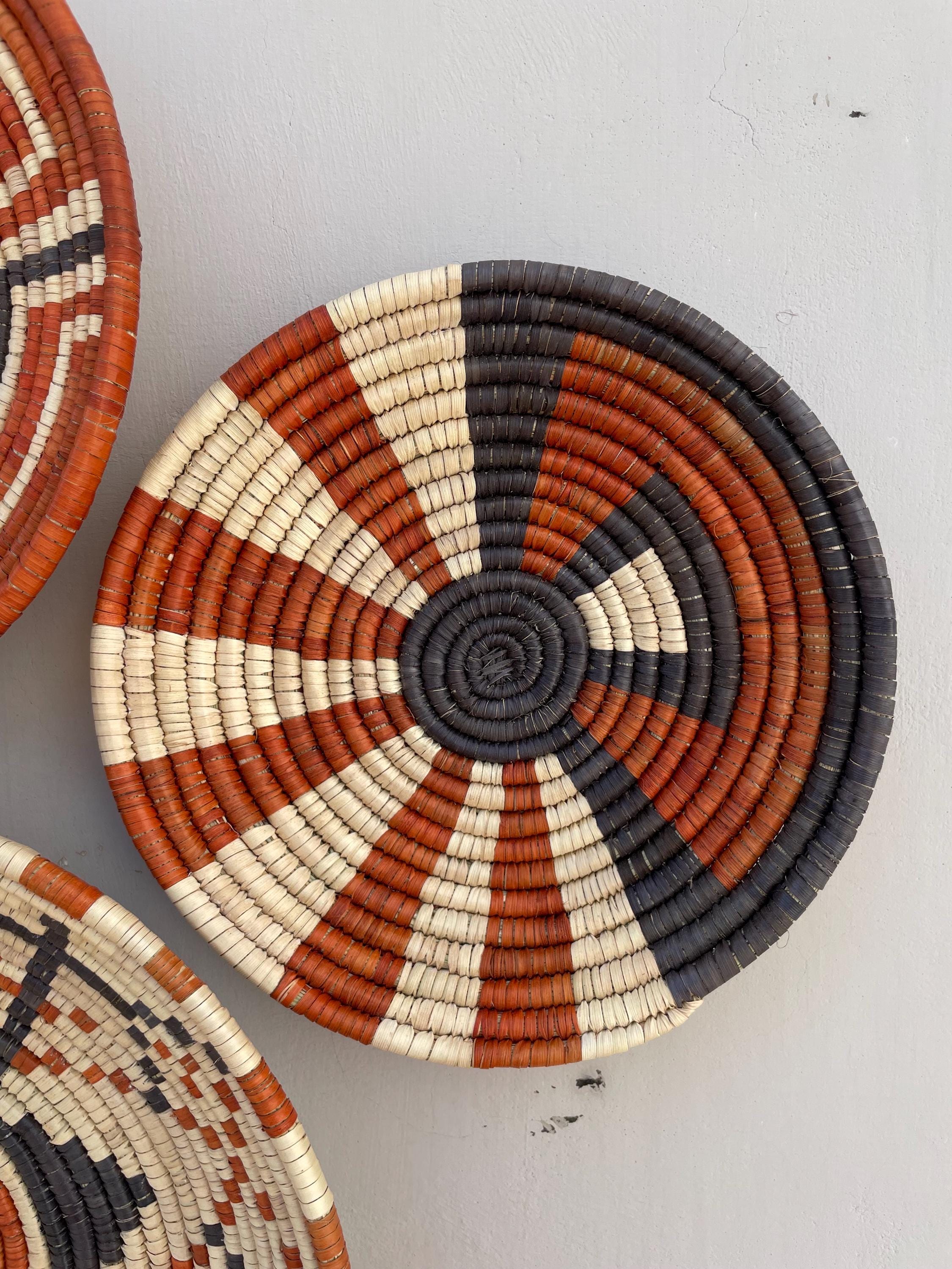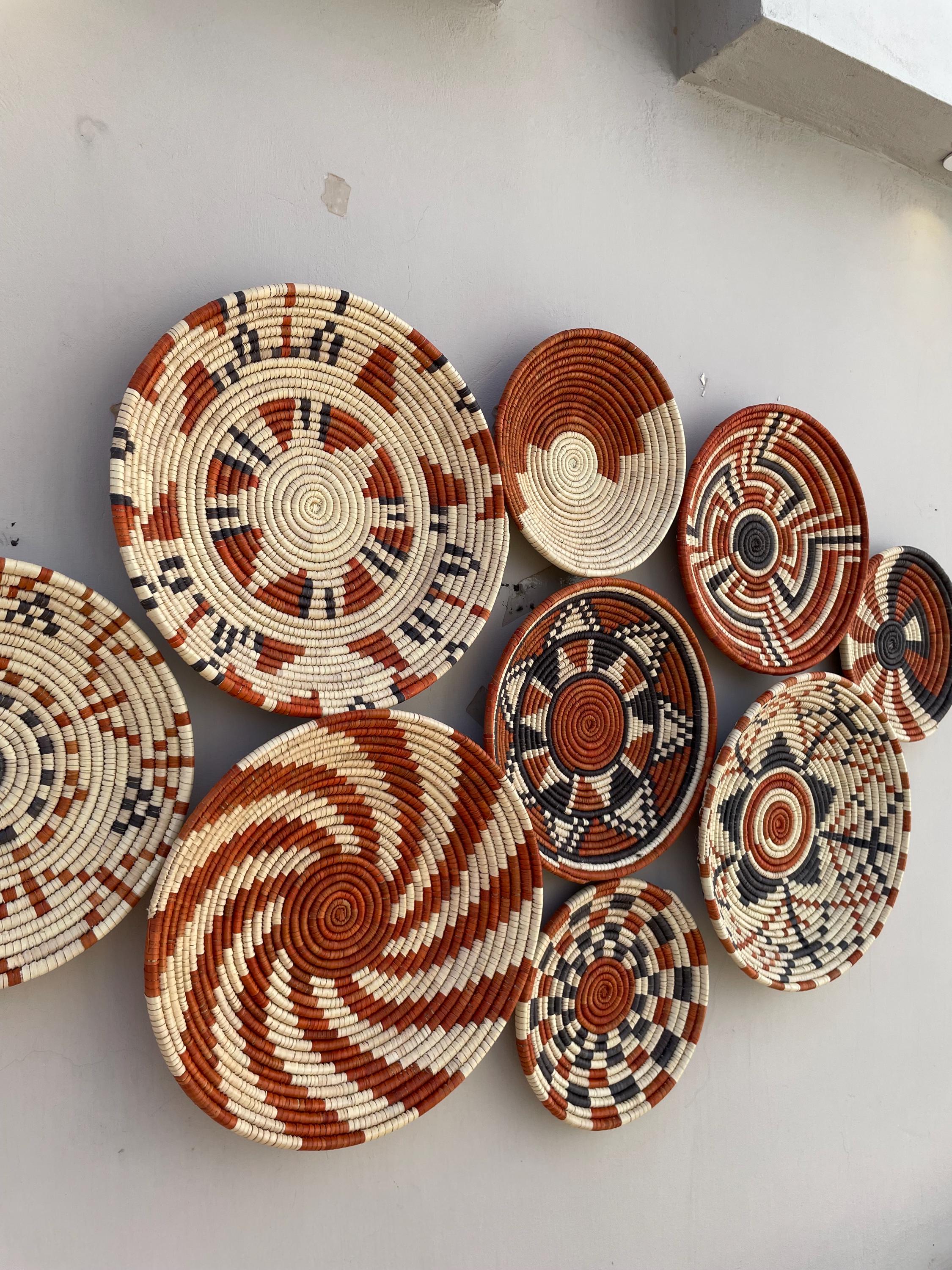 This set of nine boho wall baskets combines traditional craftsmanship with a contemporary aesthetic, featuring bold, striking patterns that bring an neutral colors to any room, these woven wall baskets add texture, depth, and a globally inspired touch to your decor.