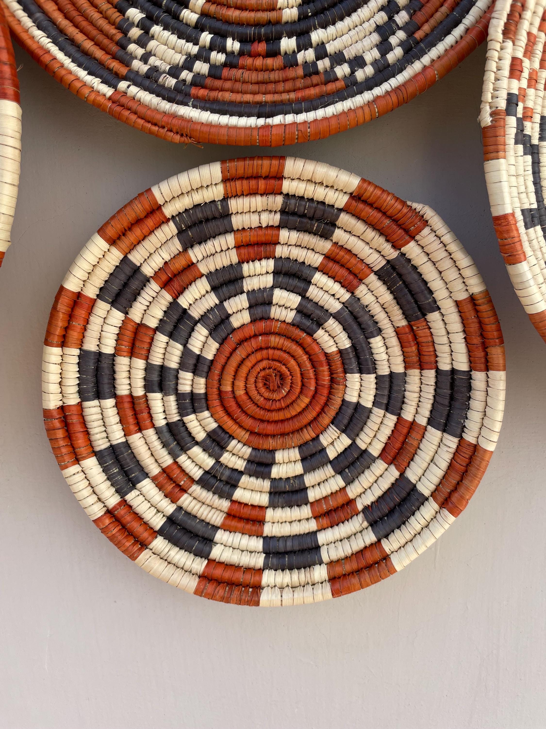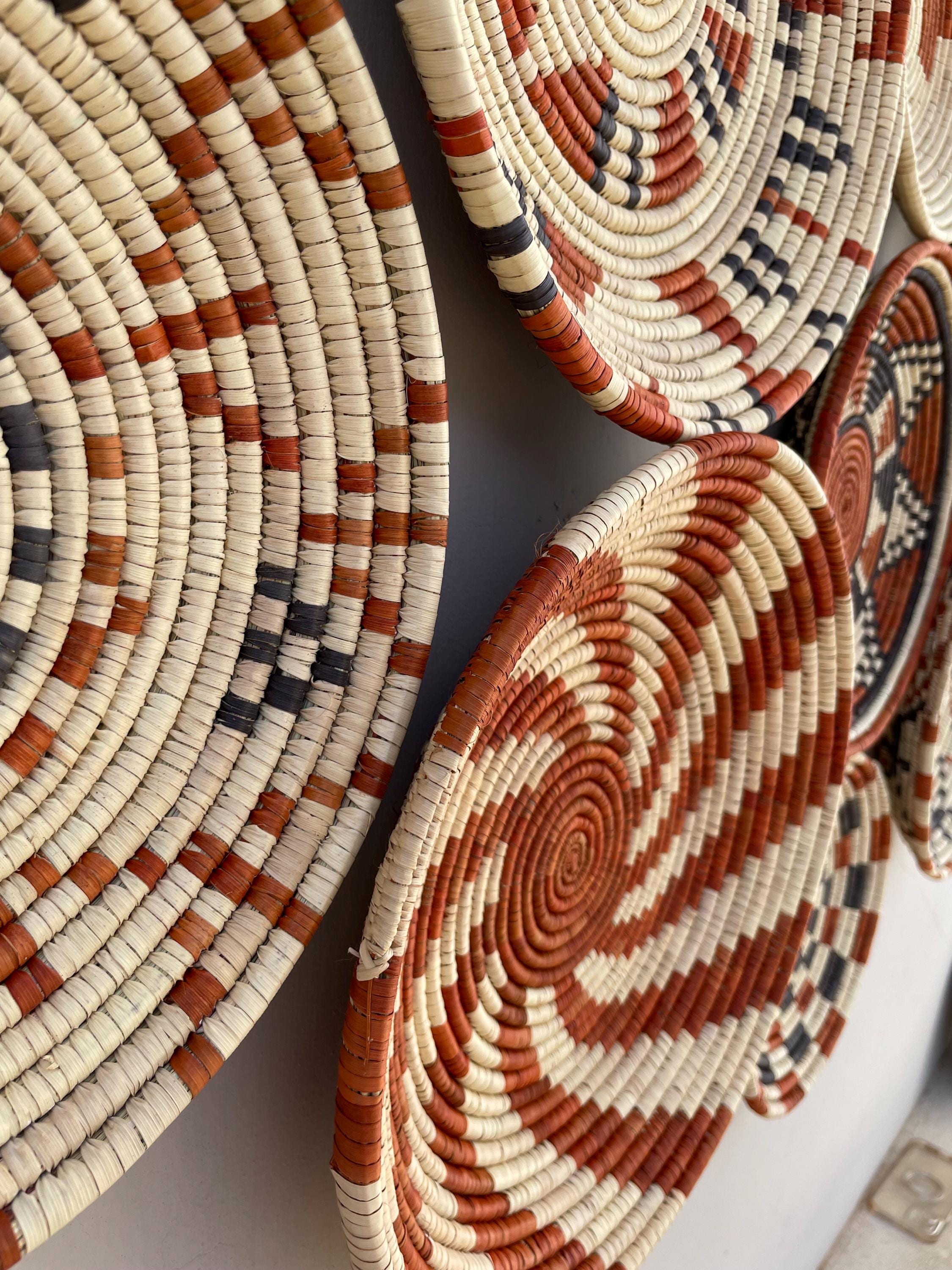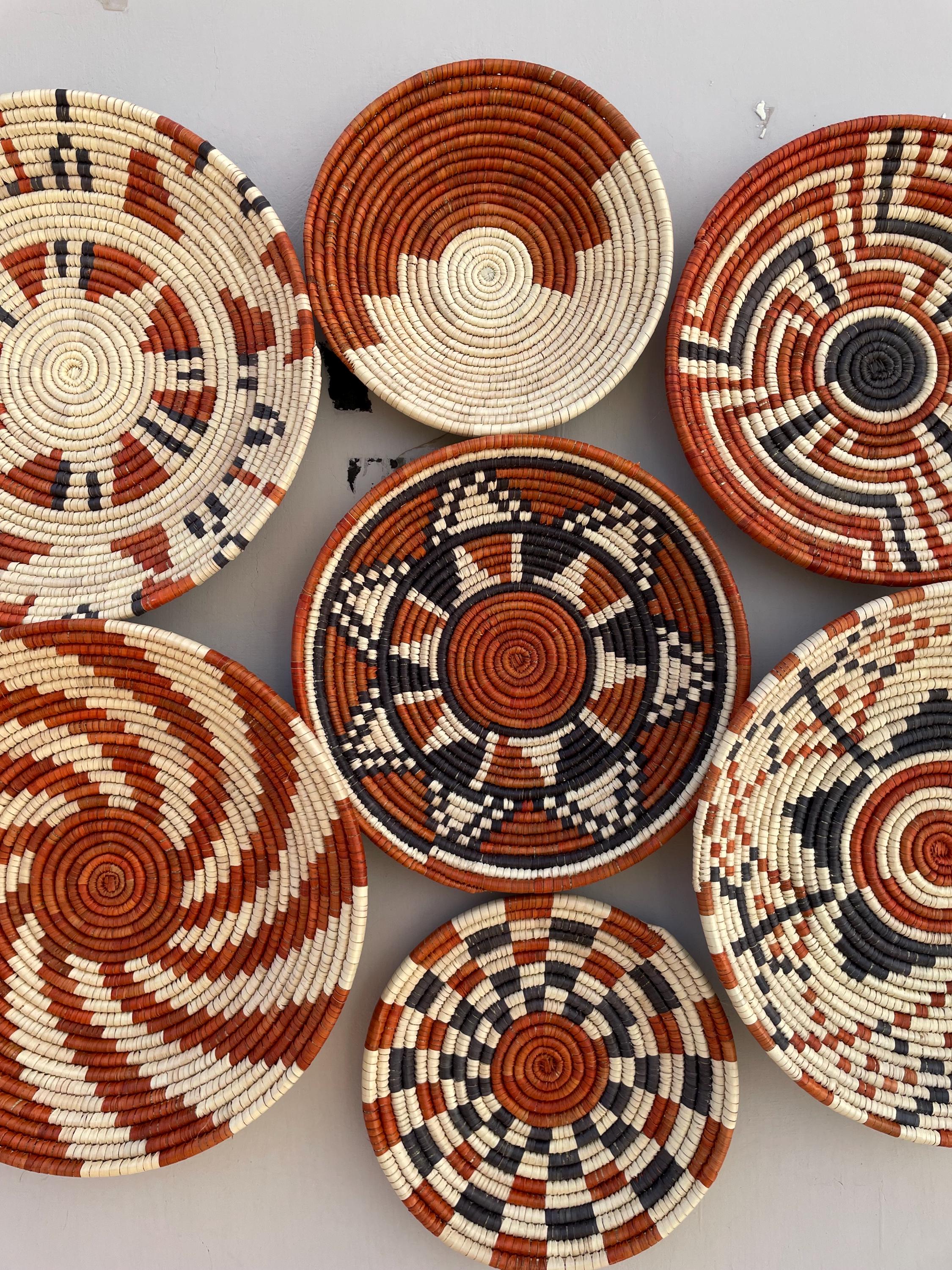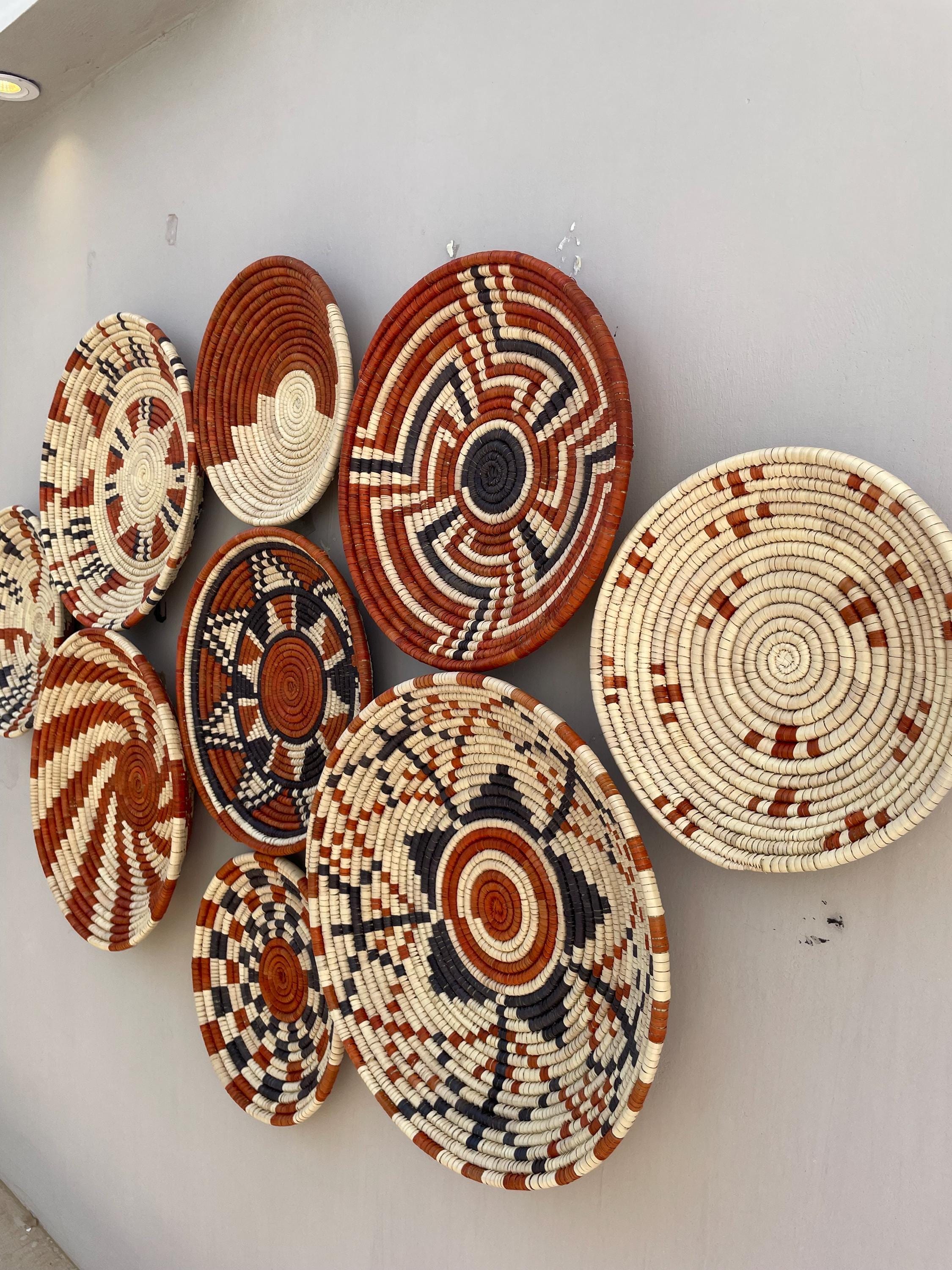 Bring warmth, texture, and artistry to your home with this stunning set of nine handwoven wall baskets. Each african style basket is beautifully crafted from natural fibers using traditional weaving techniques, creating unique geometric and tribal-inspired patterns in earthy tones of terracotta, black, and ivory.