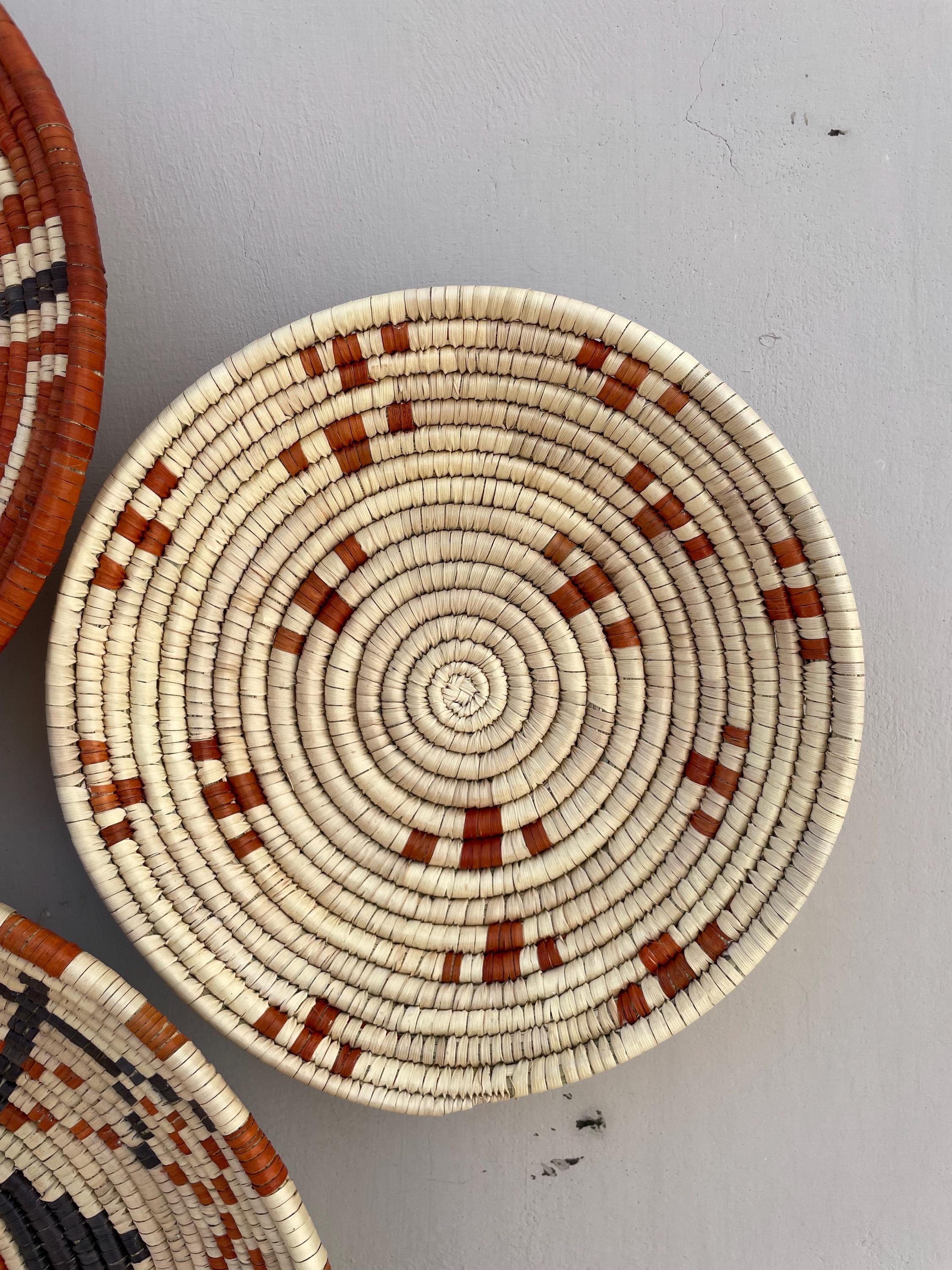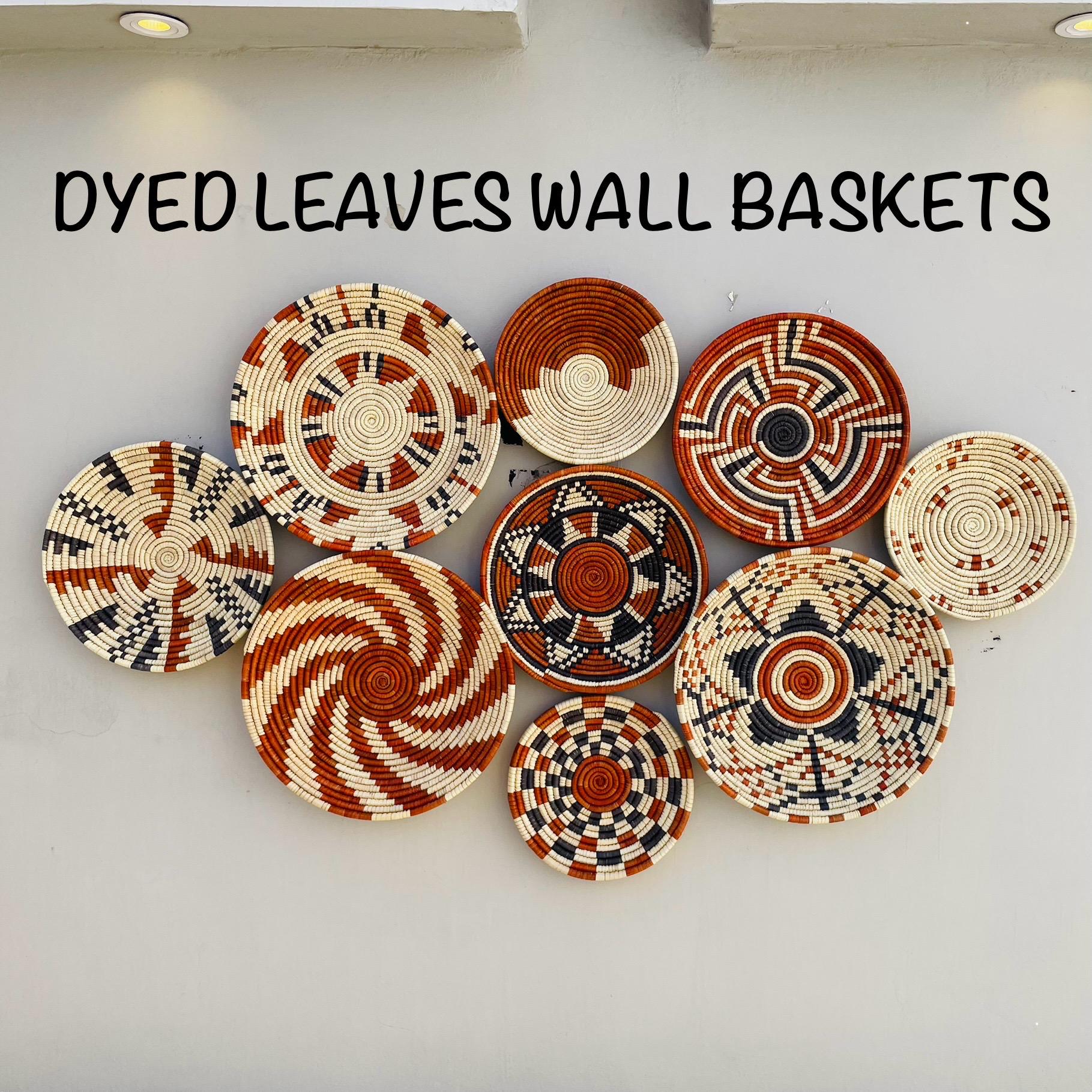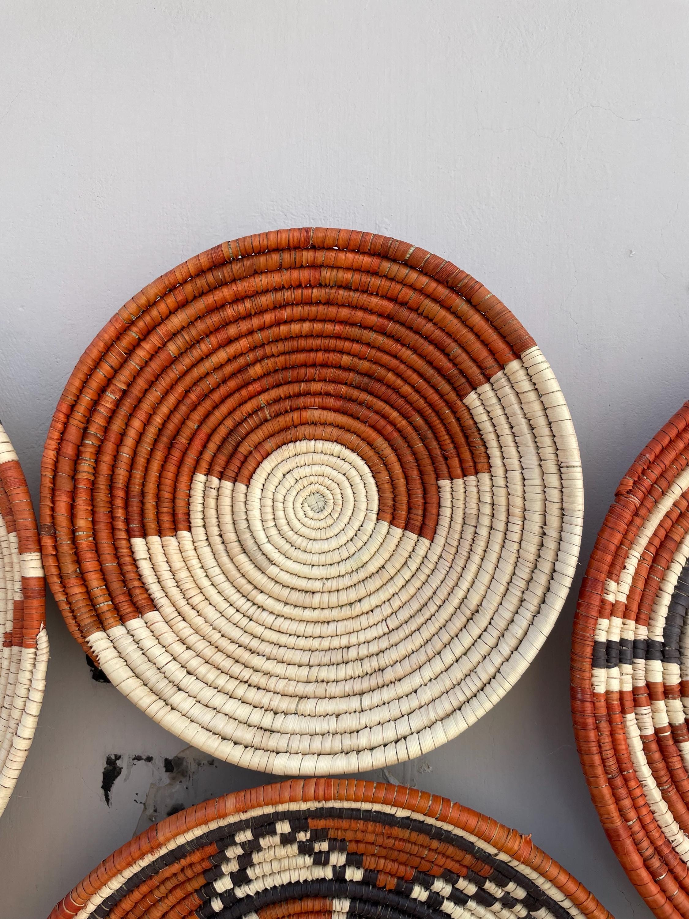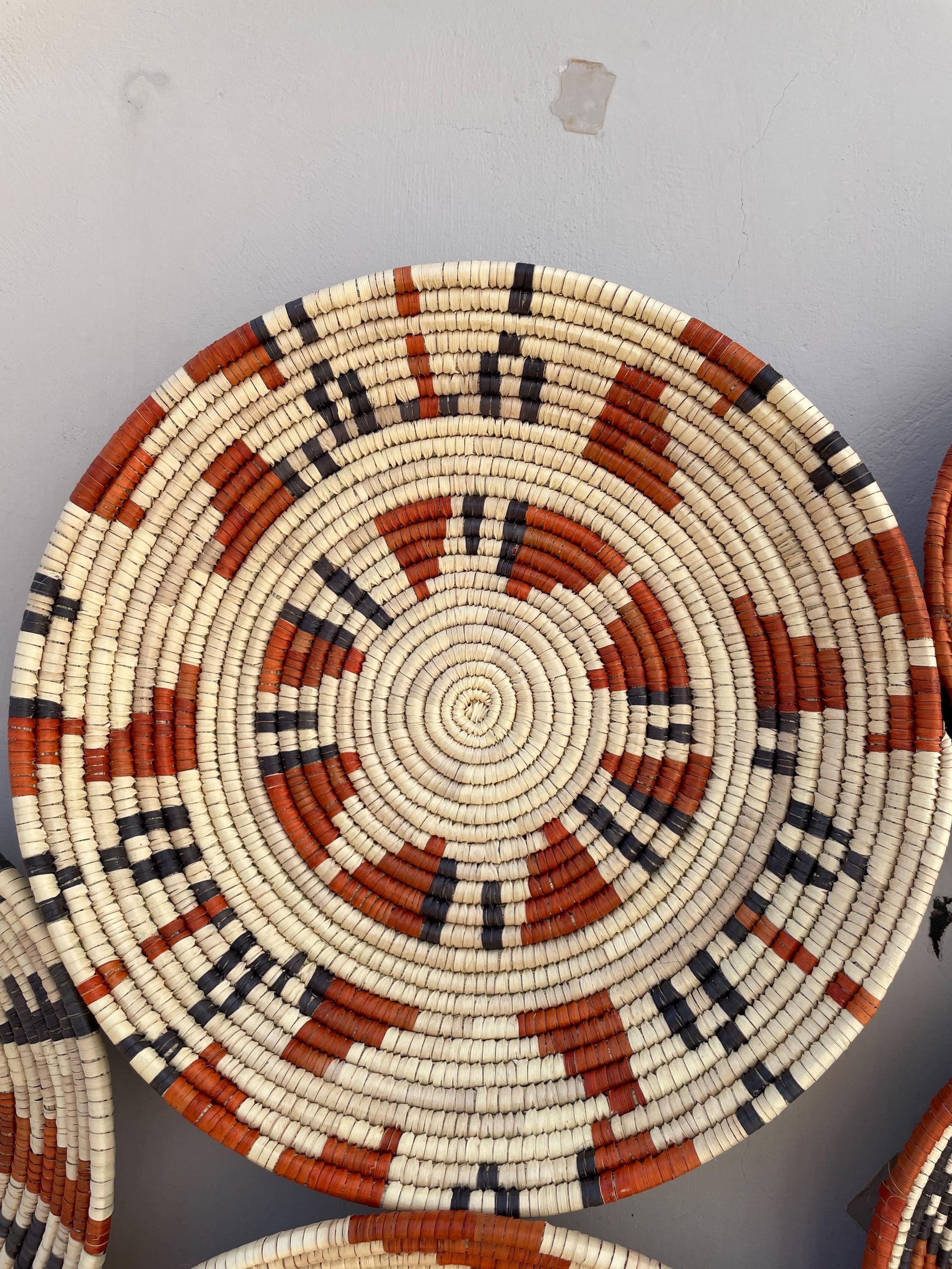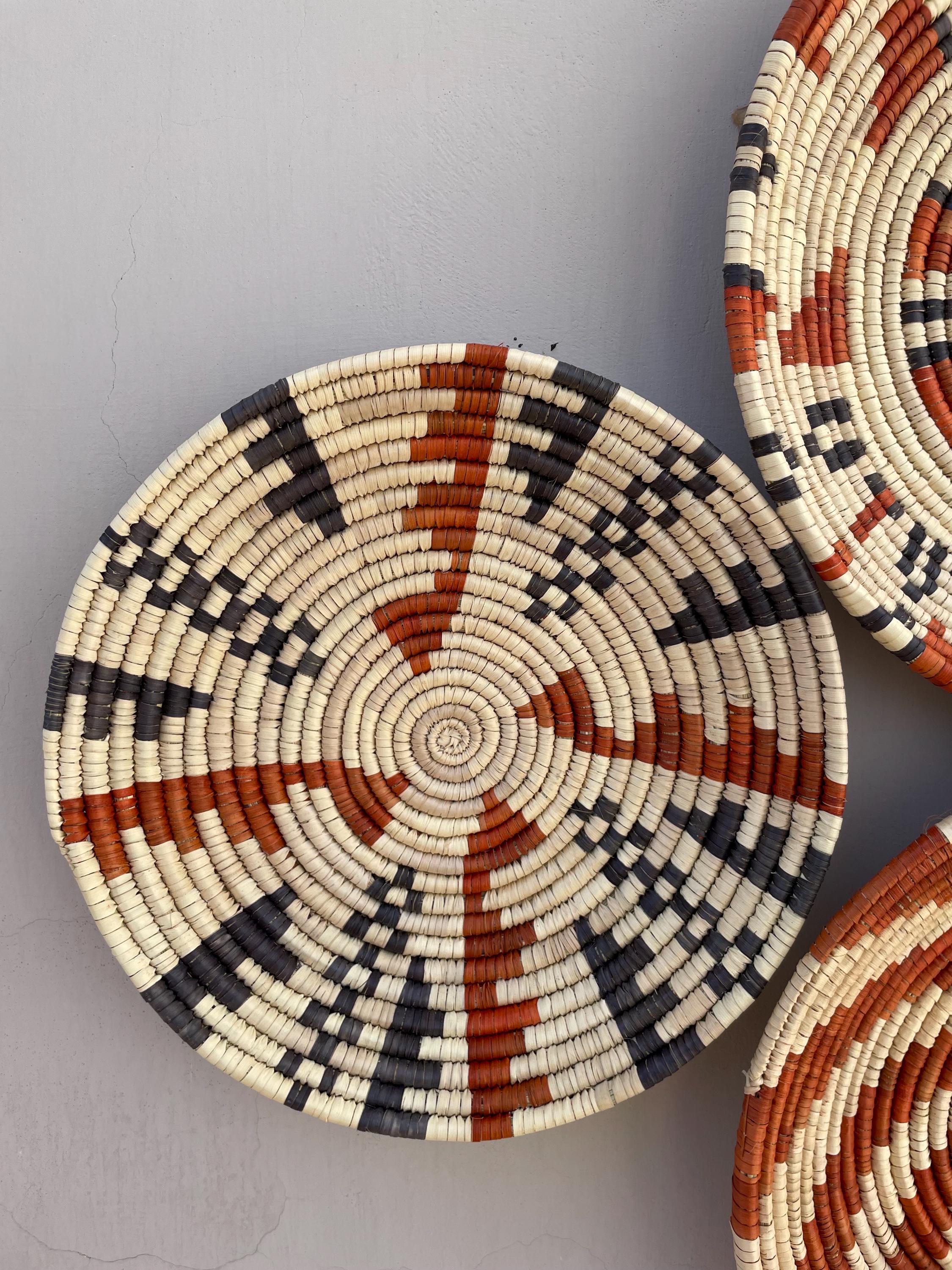 Bring warmth, texture, and artistry to your home with this stunning set of nine handwoven wall baskets. Each african style basket is beautifully crafted from natural fibers using traditional weaving techniques, creating unique geometric and tribal-inspired patterns in earthy tones of terracotta, black, and ivory.