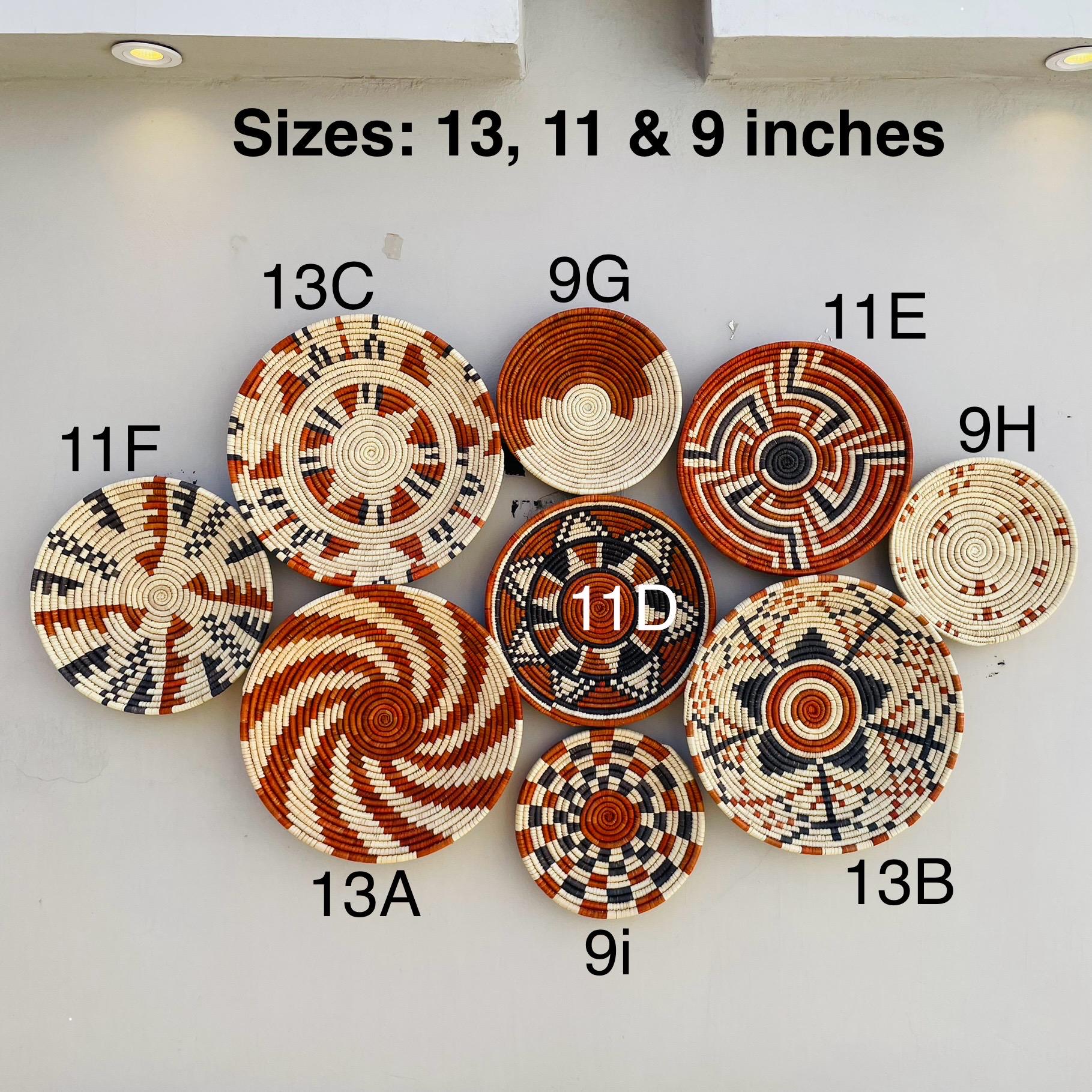 Our earthy collection features a mix of designs—from bold spirals and starbursts to intricate diamond and striped patterns. Every piece is slightly different, yet together they form a perfectly balanced wall display that instantly adds depth and character to any space.